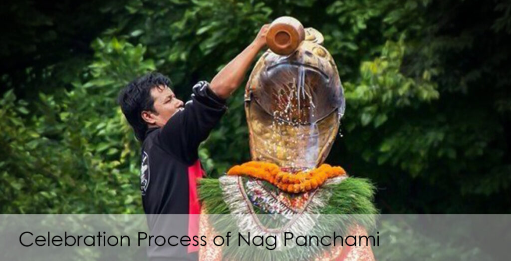 On the day of Nag Panchami, the decorated snakes’ image is used to decorate homes on very early morning of Nag pachmi. These images are commonly hung above the entry doors in Kathmandu valley with a cow dung paste. These offerings are in the form of milk, dubo (a sacrosanct kind of grass), sesame seeds, barley. nuts & lava (puffed rice). In addition to carrying out these rituals in their homes, people also make a visit to the temples and sacred places that are associated with snake deities. In Nepal, major locations are Nag Pokhari in Kathmandu, Nag Daha in Lalitpur, and Changu Narayan in Bhaktapur city, Taudaha in Kirtipur are the most important pilgrimage area. Celebration-time of Nag Panchami also signals the upcoming all-important Hindu major festivities lined up within this season.